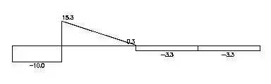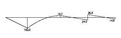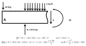 In practical applications the entire stepwise function is rarely written out. The only parts of the stepwise function that would be written out are the moment equations in a nonlinear portion of the moment diagram; this occurs whenever a distributed load is applied to the member. For constant portions the value of the shear and/or moment diagram is written right on the diagram, and for linearly varying portions of a member the beginning value, end value, and slope or the portion of the member are all that are required.[5]