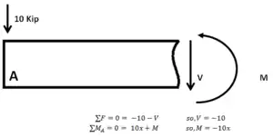 With the loading diagram drawn the next step is to find the value of the shear force and moment at any given point along the element. For a horizontal beam one way to perform this is at any point to "chop off" the right end of the beam.