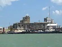 Sheerness Dockyard initially functioned as an extension to that at Chatham and it was overseen by Chatham's resident Commissioner for much of its early history. It was conceived primarily for the repair and maintenance of naval ships; with one small exception, no shipbuilding took place until 1691.[9] Low quality housing, the poor water supply near the dockyard and a likelihood of contracting ague from the surrounding marshland all led to a lack of workers and caused construction delays.[3] The first dry-dock was not completed until 1708; a second was added in 1720.[10] Access to the two dry docks was by way of a tidal basin, tellingly known as the Mud Dock; there was a small shipbuilding slip to its north and an ordnance wharf to the south, with timber stores and a mast pond beyond.[10]
