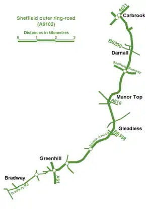 It begins in Bradway as the B6054 Bradway Road, progressing anticlockwise as Greenhill Parkway, crossing the A61 Meadowhead/Chesterfield Road South into the A6102 Bochum Parkway, which turns north, passing through Norton. Heading east again, at Lightwood, it becomes the dual-carriageway A6102 Norton Avenue. After intersecting with White Lane at Gleadless Townend and passing Gleadless Townend Supertram stop, it becomes Ridgeway Road. It carries on northwards to intersect with City Road at Manor Top, where it becomes Prince of Wales Road, before traversing the Manor and Wybourn Estates, passing to the west of the Advanced Manufacturing Park and meeting the A57 Sheffield Parkway (which is grade separated). Still as Prince of Wales Road, it passes to the west of Sheffield Business Park, Tinsley Park Golf Course and the former Sheffield City Airport through the suburbs of Darnall and Attercliffe. It now heads north-west now named Greenland Road and passes over the River Don and to the North-east of Sheffield Arena and Don Valley Stadium. There are junctions here with the A631 Shepcote Lane and Attercliffe Common (where the ring road terminates as Broughton Lane) heading northeast to the M1 at Junction 34, Tinsley Viaduct.