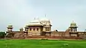 On the eastern side of the central hauz there is a small rectangular tank connected with a raised open drain coming from further east. The tank had on the northern side a small cistern having cussed patterns on both longitudinal ends and a copper fountain in the center. The water used to run through a concealed conduit pipe provided below the lime plastered surface, meant for the flow of water from the cascade. The Park now popular as the Harshvardhan Park is entered through an elaborate double storey gateway, located in the center of the eastern wall from which one of the paths leads to all its four sides, hosting on the exterior, a series of double roomed chambers, on three sides i.e., the east, north and west respectively with provision of niches and alcoves on its walls. The western wing of this sarai however had double storeyed chambers which could be reached through a flight of steps provided at the center and towards the extreme south-western corner. Exactly opposite to the main entrance gateway was another majestic structure, constructed just like the main entrance gateway. However this structure didn't carry any entrance from the ground floor, but had an opening towards the west on the upper storey. This opening on the upper floor gave a direct accessibility from the Raja Harsha-ka- Tila located west of the sarai and the chamber is constructed in such a way that probably this was the place from where an authority used to address the gathering below within the sarai.[5] West of the tomb are the ruins of Harsh-ka- Tila. Excavations conducted at this site revealed a continuous habitation at the site from about the first century A.D. to the late Mughal period. The findings of a few sherds of painted Grey Ware along with associated plain grey, black-slipped and red wares in pre-Kushana levels also suggest the inhabitation of the site in the first millennium B.C.