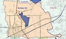 Sheldon ISD covers a large portion of northeast Harris county. From west to east, it is geographically bounded by Greens Bayou on the west, and by the San Jacinto River on the east. Its southern boundary runs along the Crosby Freeway until Beltway 8 and Carpenters Bayou where the boundary line drops south to include Liberty Lakes subdivision. Its northern boundary follows an arbitrary line that extends from Greens Bayou on the west, to south of Lake Houston.