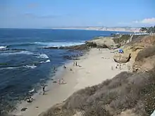 During extreme low tides, the southern end of Shell Beach has an interesting tidepool-like area, with many marine creatures visible.[2] Because of the presence of reef structures and rip currents that can be hazardous to scuba divers, the San Diego Council of Divers provides a "Rocks, Rips and Reefs" tour for the area.[3] Visible to the south a short distance out from Shell Beach is Seal Rock, which often has a number of harbor seals resting on it. There is presence of sea glass on the beach.[4]