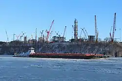 On September 20, 2018, two of the world's largest cranes arrived on site. The largest of the pair is almost 700 feet (210 m) tall and can lift 3,500 tons at a time, and is used around the globe on megaprojects. The smaller of the two is 430 feet (130 m) tall and can lift about 2,300 tons in its current configuration.[16]