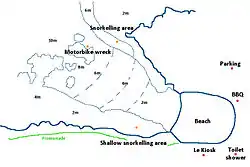 Facilities include 2 free electric barbecues, showers, toilets and a kiosk selling meals, drinks and coffee. There is a restaurant on the beach called The Boathouse Shelly Beach.[14] There is a bush track around the headland with views of the Northern Beaches and North Head. The facilities also include parking at the rate of $8.00 an hour. Many scuba diving centres take students because it offers excellent conditions for an environment in which to learn SCUBA.[15][16]