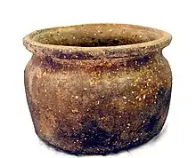 Shelly wares refer to several types of shell tempered wares found during the Anglo-Saxon and early medieval era in Britain. The pottery can be divided into several groups characterized by region and time period. Shelly ware fabric is tempered with crushed marine shell or fossil shell, depending upon the location of the source of shell.[9] Shelly ware was typically handmade and fired on a bonfire until the early tenth century. By the middle of the tenth century, wheel thrown production was replacing hand made pottery manufacturing in the east midlands, Upper Thames Valley, and southeastern england.[10]