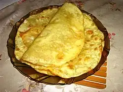 Shelpek (Turkmen: çelpek; Kazakh: шелпек, romanized: shelpek; Kyrgyz: май токоч, челпек; Uzbek: чалпак, romanized: chalpek; Uyghur: чалпак, romanized: chalpyak) is a traditional Central Asian flatbread commonly consumed all over the region. The main ingredients of shelpek are flour, milk, sugar, butter, sour cream such as Kaymak, baking soda, salt and vegetable oil.[1]
