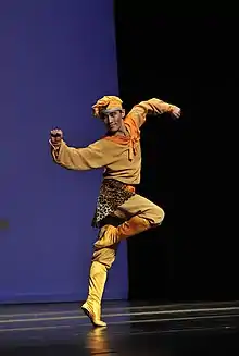 Shen Yun's dancers perform wearing intricate costumes, often accompanied by a variety of props.[9][20] Some costumes are intended to imitate the dress of various ethnicities, while others depict ancient Chinese court dancers, soldiers, or characters from classic stories.[9] Props include colorful handkerchiefs, drums,[9] fans, chopsticks, or silk scarves.[27][33]