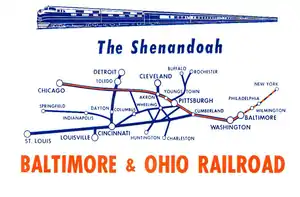 The Shenandoah was an American named passenger train of the Baltimore and Ohio Railroad (B&O), one of four daily B&O trains operating between Jersey City, New Jersey and Grand Central Station in Chicago, Illinois, via Washington, D.C. and Pittsburgh, Pennsylvania from the 1930s to the 1950s. Other B&O trains of that period on the route were the Capitol Limited, Columbian, and the Washington–Chicago Express.[3] An alternate branch originated in Detroit and met with the Chicago part of the train at Deshler, Ohio, south of Toledo.