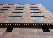 The building was designed by AOS Arkitekter and built from 1969 to 1971. The hotel has nine floors and a rooftop floor, and has a reddish-brown facade of glassed chamotte facing Vasagatan and Tegelbacken, and a brown facade facing Herkulesgatan. The facade on the inner yard is white and there is a portal originally belonging to the Wrede Palace at the inner yard.[4] The facade plates are 50 cm × 50 cm (20 in × 20 in) and 70 cm × 30 cm (28 in × 12 in) in size and were made by the company Ifö Sanitär in Bromölla.[5]