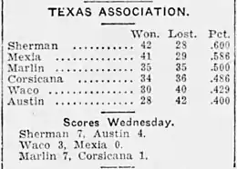 - "No Pennant to be Awarded in the Texas Association; Sherman Plans to Appeal". Austin American-Statesman. September 24, 1923. p. 6. Retrieved August 25, 2020 – via newspapers.com.