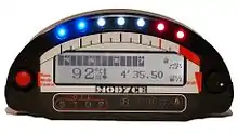 A shift light is a warning lamp fitted to vehicles in order to indicate to the driver that maximum revolutions per minute (r/min) has almost been reached. Ideally a shift lamp will illuminate at the engine speed beyond that which delivers the maximum power, measured in for example kilowatt (kW) or brake horsepower (BHP), such that the power before and after shifting is the same. Accelerating the engine beyond this point is not conducive to ideal acceleration. In use a shift light allows the driver to judge the exact point that a gear change should be carried out without having to glance down at the tachometer. This also increases safety for the driver by keeping their focus near the track at all times.[1]
