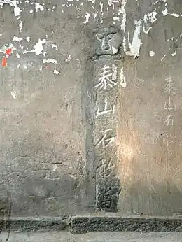 Shigandang (simplified Chinese: 石敢当; traditional Chinese: 石敢當; pinyin: shí gǎn dāng; Wade–Giles: shih-kan-tang; Japanese: 石敢當, romanized: ishigantō) is an ornamental stone tablet with writing,[1] which is used to exorcise evil spirits in east Asia. 石敢當 are often associated with Mount Tai, and are often placed on street intersections or three-way junctions, especially in the crossing, which is often considered a spiritually dangerous place (凶位).