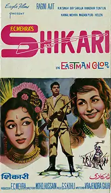 Shikari (transl. Hunter) is a 1963 Indian Hindi-language film directed by Mohammed Hussain. It stars Ajit, Ragini, Helen, Madan Puri, K. N. Singh and others.[1] The music of the film was the biggest asset of this film, and the songs "O, Tumko Piya, Dil Diya", "Mangi Hain Duaayen", "Ye Rangeen Mehfil" and "Agar Main Poochhoon", were catchy tunes that became popular on the music chart of the year. The film was loosely based on Hollywood films Dr. Cyclops and King Kong.[2]