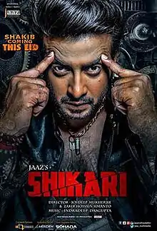 Shikari (transl. Hunter)[3][4] is a 2016 Bangladesh-India joint venture Action thriller film directed by Joydip Mukherjee and Zakir Hossain Simanto. Produced by Abdul Aziz and Himanshu Dhanuka under the Jaaz Multimedia and Eskay Movies banners and it stars Bangladeshi superstar Shakib Khan, Srabanti Chatterjee, Rahul Dev and Sabyasachi Chakrabarty in pivotal roles and centers around Khan, a disguised professional assassin with mysterious past, tasked with assassinating a top government official. The film also features Amit Hasan, Kharaj Mukherjee, and Shupriyo Dutta in supporting roles.[5] The soundtrack album and background score of the film was composed by Indraadip Dasgupta.[6]