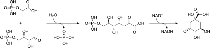 Phosphoenolpyruvate and erythrose-4-phosphate condense to form 3-deoxy-D-arabinoheptulosonate-7-phosphate (DAHP), in a reaction catalyzed by the enzyme DAHP synthase. DAHP is then transformed to 3-dehydroquinate (DHQ), in a reaction catalyzed by DHQ synthase. Although this reaction requires nicotinamide adenine dinucleotide (NAD) as a cofactor, the enzymic mechanism regenerates it, resulting in the net use of no NAD.