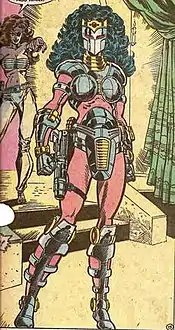 Wonder Woman's initial contact with the first Shim'tar occurred when her Lasso of Truth was stolen by her enemy The Cheetah.[2] The chase led them both to Egypt.[3] There, Diana found a lost tribe of Amazons in the city of Bana-Mighdall.[4] These Amazons, she discovered, were apparently descendants to her aunt Antiope.[5] A dissident of that tribe named Faruka plotted to become that tribe's queen. She chose a powerful unnamed Amazon to act as her enforcer. Calling herself Shim'Tar, this warrior had cybernetic implants that not only greatly enhanced her strength, but also provided her with laser capabilities and durability.[6] After killing the desert Amazon tribe's regent queen, Shim'Tar battled Diana at Faruka's request. She proved to be more than a match for Diana. Diana was unable to defeat the superior Shim'Tar in direct combat; in much of the battle, Shim'Tar gives Diana a brutal and thorough beating. Diana barely managed to defeat Shim'Tar and was only able to defeat her by ensnaring her in her golden lasso. She discovered that the Shim'Tar warrior gained the majority of her enormous power by wearing the Golden Girdle of Gaea; it is possible that the original Shim'tar's superiority over Diana was due to Shim'Tar's possession of the Girdle, in addition to her cybernetic implants. This Shim'Tar seemingly died when the Amazon city was attacked by the Egyptian military and Olympian god Hermes, causing a massive explosion.[7] This first Shim'Tar's true identity remains a mystery to this day.