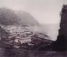 Shortly before his death, Nariakira was left with only a two-year-old son (Tetsumaru) and eight-year-old daughter (Teruhime). He had been forced to ask Narioki to decide between Hisamitsu or Hisamitsu's son Tadayoshi to succeed him as daimyō.[23] Saigō and Ōkubo felt the death of all of Nariakira's viable heirs was caused by Yura and wanted retribution, but Nariakira would not allow it.[24] On July 8, 1858, Nariakira was supervising the joint preparatory maneuvers in Tempozan for sending 3,000 Satsuma soldiers to Edo, and he succumbed to the heat. He was transported to Tsurumaru Castle, where he died on the 16th. A few years after his death, he was deified as a Shinto kami, Terukuni-daimyōjin. His son Tetsumaru died shortly after his father.
