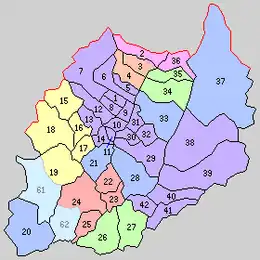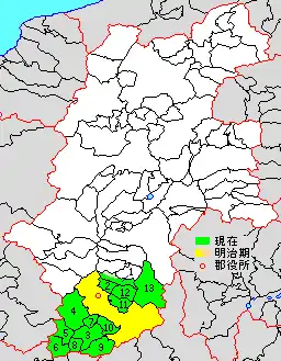 * yellow - areas formerly within the district borders during the early Meiji period