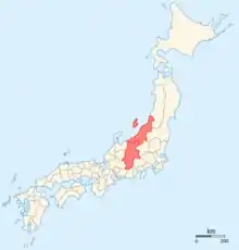 The area encompasses the old provinces of Shinano and Echigo. Though the name is a combination of those two provinces, the region also contains Sado Island from Sado Province. It is located in the modern-day prefectures of Nagano and Niigata.