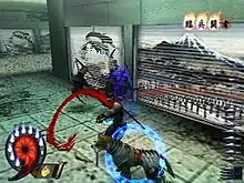 Combat is hack and slash-based,[4] involving large numbers of recurring enemies.[2] Hotsuma's sword, Akujiki, is his primary weapon. Akujiki feeds on souls, initially devouring those of the enemies he kills, then that of Hotsuma himself if he does not kill any enemies for too long. This leads to an emphasis on killing all enemies in a battle as quickly as possible. To ensure that Akujiki's hunger remains sated, Hotsuma can kill four or more enemies with no more than a few seconds between each kill to perform an exaggeratedly violent "TATE" attack that will release more souls for Akujiki. The mechanic of jumping from enemies after dispatching them adds an element of platform gameplay.[5]