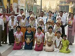 Shinbyu is considered one of the Twelve Auspicious Rites in Burmese culture. It is deemed the most important duty that parents owe to their son by letting him go forth and embrace the legacy of Gautama Buddha, join the sangha and become immersed in the teachings of the Buddha, the Dhamma, at least for a short while, perhaps longer if not for the rest of his life. A boy may become a novice on more than one occasion, but by the age of twenty there will be another great occasion, the upasampada ordination, in which the boy becomes a fully ordained bhikkhu (ပဉ္စင်း bazin).[1] Those who are not blessed with a male child will seek for an orphan boy or a boy from very poor families in order to receive this special dispensation by the Buddha and hence gain great merit by the act. Shinbyu may well be regarded as a rite of passage or coming of age ceremony as in other religions. Allowing a son to spend some time however short it may be, in a kyaung (Burmese Buddhist monastery) is regarded by most Burmese Buddhists as the best religious gift that his parents can give him and it is believed to have a lasting effect on his life.