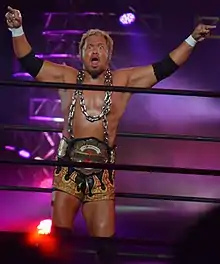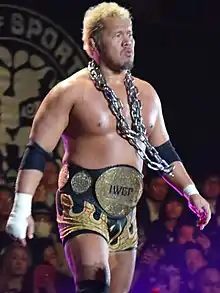 In March 2010 Makabe entered the 2010 New Japan Cup and defeated Tomohiro Ishii, Toru Yano and Tetsuya Naito to advance to the finals, where he was once again defeated by Hirooki Goto in a rematch of their 2008 G1 Climax final match.[64] After Goto failed in his title match against the IWGP Heavyweight Champion Shinsuke Nakamura, Makabe laid a challenge for the belt and on May 3, 2010, at Wrestling Dontaku 2010, defeated Nakamura to win the IWGP Heavyweight Championship.[65][66] On June 19 at Dominion 6.19, Makabe made his first successful title defense, defeating Pro Wrestling Noah's Go Shiozaki.[67] On July 19 Makabe successfully defended the IWGP Heavyweight Championship against previous champion Shinsuke Nakamura.[68] The following month Makabe entered the 2010 G1 Climax tournament. After a rocky start, which included losses to Tetsuya Naito and former tag team partner Toru Yano, Makabe came back with a four match winning streak, only to lose to Hiroshi Tanahashi on the final day of the tournament and thus miss advancing to the finals.[69][70][71][72][73][74][75] On October 11 Makabe lost the IWGP Heavyweight Championship to G1 Climax winner, Satoshi Kojima.[76]