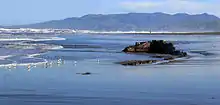 Left in place at extreme low tide level in 1878, what is left of the wreck of the King Philip is usually covered in sand. Sometimes, as the profile of the sand on the beach shifts and changes, the timbers reemerge and are visible during low tide. The wreck was partially visible when the schooner Reporter wrecked on the same site on March 13, 1902. Contemporary accounts noted that the Reporter was "fast digging her own grave alongside the bones of the "King Philip", whose ribs are still seen..." The wrecks of both ships were buried in 1910 when a large amount of sand was pushed on to the beach as sand dunes were bulldozed during construction of the Great Highway. The first documented re-exposure came in 1982. Another re-exposure occurred in 1983. In March of that year, National Park Service archaeologist James Delgado documented the site with fellow archaeologist Martin T. Mayer. The wreck was re-exposed in May 1984 to a hitherto unseen level of exposure, when Delgado and a larger team returned to document more of the hull. That project determined the ship was nearly half intact (45%) from the keel to the 'tween deck level, which was still partially sheathed in "yellow", or Muntz metal, and was ballasted with rocks from San Francisco's Telegraph Hill. Tangled wire rope, rigging elements, and timbers from the schooner Reporter were also found mixed into the hull. In 1984, the wreck was exposed extensively enough to allow exploration by divers.[1] After its appearance in 1985, the wreck was not visible for 22 years.[2] The construction of the Ocean Beach sewer outfall resulted in more dumping of sand on Ocean Beach. This caused the ship to be buried again. It was re-exposed in November 2010, three years after its previous appearance.[3] As of April 2011, the wreck was again visible, this time to the same extent as it had been in 1984. Stephen Haller, the park historian for the Golden Gate National Recreation Area of the National Park Service, says that the King Philip is the best-preserved wreck of a wooden ship in the San Francisco Bay area, which has a total of approximately 200 old shipwrecks.[2][4]