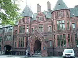 The new building, which was designed by Alfred Waterhouse in the Gothic revival style, was built in brick with red terracotta facings by John Wood & Son of Leeds and completed in 1881.[1][3] The design involved a main frontage with five bays facing onto St Paul's Square; the central section of three bays, which was symmetrical, featured an arched porch on the ground floor with a coat of arms in the gable and a finial above; there were transom windows on the ground floor and the first floor and mullion windows on the second floor with turrets at roof level.[1] The southern elevation of the building abutted the north bank of the River Great Ouse.[4] Internally, the principal rooms were a large baronial hall and some courtrooms.[2]