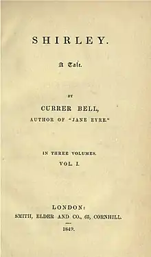 Shirley, A Tale is a social novel by the English novelist Charlotte Brontë, first published in 1849. It was Brontë's second published novel after Jane Eyre (originally published under Brontë's pseudonym Currer Bell). The novel is set in Yorkshire in 1811–12, during the industrial depression resulting from the Napoleonic Wars and the War of 1812. The novel is set against the backdrop of the Luddite uprisings in the Yorkshire textile industry.