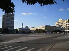 Victory Square with tank monument and Cathedral in Zhytomyr.
