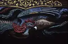 Several rounds of expansions, improvements, and repairs have been undertaken since then, and it was designated a prefectural tangible cultural property by Shizuoka Prefecture after major repairs in 1971. The most recent overhaul was finished in November 2013. The seven-year project entailed completely breaking down and reassembling the building piece by piece. All the parts were catalogued, mapped, and their condition recorded. Damaged structural members were repaired or replaced, and decorative fixtures such as transom carvings and other artwork, were painstaking restored. When the building was reassembled, aseismic structural augmentation (dampers) was installed to protect it from earthquake damage. New gold leaf was applied to the indoor pillars, and all exposed surfaces were finished with vermilion using traditional methods.[26][27][28] The building is known for its decorative transoms that depict various Buddhist deities that are believed to occupy the Treasure Tower of the Lotus Sutra. A decorative Stupa is erected nearby the Mieido to commemorate the donations of Lady Manhime Ogasawara remains present to this day.