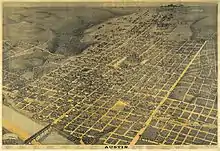 Shoal Creek was named by Edwin Waller, and its mouth roughly marked the western city limits of Austin in the original 1839 Waller Plan of the city.[4][7] In the "Bird's-Eye View" map by Augustus Koch, Shoal Creek is the large canyon on the left side.