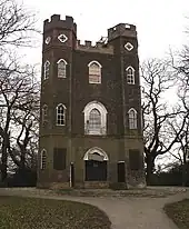 Another water tower (of 130 ft) is further west down Shooter's Hill. This was originally built in the 1890s to designs by Thomas W. Aldwinckle to supply water to the 'Brook Fever hospital', which was demolished in the 1990s, to be replaced by a housing development. The tower consists of a plain brick pillar ornamented simply with bands of terracotta tiles and windows like arrowslits. It is not listed, but it was cleaned, repointed and underpinned for conversion into a family home. It is the centrepiece of the housing estate.[8]