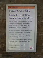 Unlike other closed stations, TfL provided a temporary service to Shoreditch until the new line fully opened in 2010 in the form of a non-stop bus service connecting Shoreditch with Whitechapel using the station's previous limited opening hours.