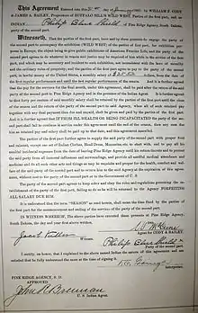 Show Indians, or Wild West Show Indians, is a term for Native American performers hired by Wild West shows, most notably in Buffalo Bill's Wild West and Congress of Rough Riders. "Show Indians" were primarily Oglala Lakota from the Pine Ridge Indian Reservation, South Dakota. Performers took part in reenacting historic battles, demonstrating equestrianism and performing dances for audiences. Many veterans from the Great Plains Wars participated in Wild West shows,[1] during a time when the Office of Indian Affairs was intent on promoting Native assimilation. Many went on to act in silent films.
