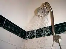 A shower is a place in which a person bathes under a spray of typically warm or hot water. Indoors, there is a drain in the floor. Most showers have temperature, spray pressure and adjustable showerhead nozzle. The simplest showers have a swivelling nozzle aiming down on the user, while more complex showers have a showerhead connected to a hose that has a mounting bracket. This allows the showerer to hold the showerhead by hand to spray the water onto different parts of their body. A shower can be installed in a small shower stall or bathtub with a plastic shower curtain or door. Showering is common due to the efficiency of using it compared with a bathtub. Its use in hygiene is, therefore, common practice.[1]