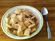 Shredded wheat is a nontrademarked breakfast cereal made from whole wheat formed into pillow-shaped biscuits. It is commonly available in three sizes: original, bite-sized (¾×1 in) and miniature (nearly half the size of the bite-sized pieces). Both smaller sizes ("Mini-Wheats" and "little bites") are available in a frosted variety, which has one side coated with sugar and usually gelatin. Some manufacturers have produced "filled" versions of the bite-size cereal containing a raisin at the center, or apricot, blueberry, raspberry, cherry, cranberry or golden syrup filling.