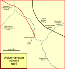 The opening of the Birmingham, Wolverhampton and Dudley Railway in 1854 finally gave the S&BR access southwards to the GWR, and the LNWR was at last powerless to frustrate the S&BR in the Birmingham area.[17] The Wolverhampton Junction Railway was an essential part of the connection. It was three-quarters of a mile long and connected the southward course of the S&BR at Stafford Road Junction into the Birmingham, Wolverhampton and Dudley Railway, at Cannock Road Junction. It was wholly owned by the Great Western Railway.