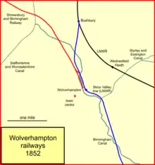 In the autumn of 1846 the LNWR took a lease of both the Shropshire Union Railway and Canal system, and of the Stour Valley Railway. The S&BR acquiesced in this, having been given assurances about traffic pooling.[8] The LNWR had acquired share of the Birmingham Canal Company, so that the LNWR now had a 50% share of the Stour Valley Railway as well as the lease. Suddenly the LNWR was dominant in the area, and the Shrewsbury and Birmingham saw that its position was precarious. However an agreement was reached with the LNWR that traffic would not improperly be diverted away from the S&BR line, and the LNWR's Bill to authorise the lease was allowed to pass. The Shrewsbury and Birmingham Railway was also given running powers over the Stour Valley line; and in addition that the short section of line from Wolverhampton station to the divergence of the Shrewsbury and Stafford lines would be joint. The running powers would lapse if the S&BR were taken over by the GWR or certain companies considered to be its allies.[10][8]