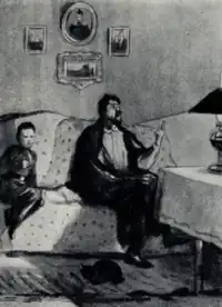 The samovar, the cups, and the tablecloth are cleared away, but the family do not leave the table, waiting now for the supper. The midwife starts hiccupping, while Pavel Vasilyevich and Styopa sit side by side examining a volume of the Niva magazine. The cook, Anna, comes into the dining-room, and asks for forgiveness everybody except the midwife to whom she considers it superfluous to bow down, since she is not one of the gentry.