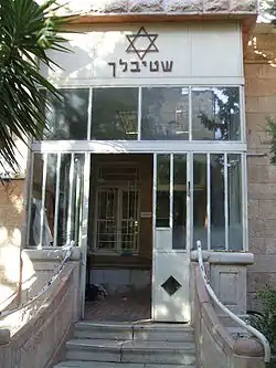 A shtiebel (Yiddish: שטיבל shtibl, pl. shtiblekh or shtiebels, meaning "little house" or "little room" cognate with German Stübel) is a place used for communal Jewish prayer. In contrast to a formal synagogue, a shtiebel is far smaller and approached more casually. It is typically as small as a room in a private home or a place of business which is set aside for the express purpose of prayer, or it may be as large as a small-sized synagogue. It may or may not offer the communal services of a synagogue.