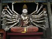 Bodhisattva Hall, called the Pusa Ting (Chinese: 菩萨厅), has a thousand-armed Guanyin. The ceiling in this hall contains depictions of a guard in the form of three-clawed round and bellied figure, and is painted green.[11] The Bodhisattva hall has the sculpture of a young, attractive looking woman said to represent the Bodhisattva, which is sculpted with many hands. The clothing is very rich and ornaments decorate the Bodhisattva. The twenty or more arms of the Bodhisattva are well-sculpted, of very fair skin, with hands set behind the head and on torso.[9]