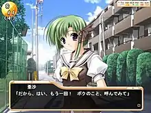 The gameplay mostly consists of reading and listening to the conversations provided. Now and then, a "Please Select Your Destiny" event will occur, giving the player multiple choices on how to respond. The choices will determine who will be Rin's destined love; depending on which route the player takes, there will be between 8 and 12 multiple-choice questions.[1] At a certain point in the visual novel, a translucent image of the destined character appears when the day changes indicating whom Rin has fallen in love with after which the multiple-choice events become almost nonexistent.[1] Near the end of the game, two sex scenes will occur.[2] After the story has been completed at least once, players can view CG (computer graphics) artwork they have observed, skip scenes or endings for characters they have viewed, and listen to the soundtracks they have heard in the game.[2]