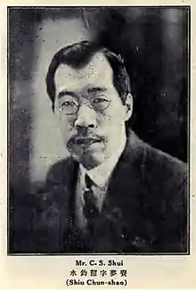 Shui Junshao (水鈞韶, 1878 – 25 August 1961), courtesy name Meng Geng, a native of Funing, Jiangsu, was a diplomat from the Republic of China and a member of the old transportation department . He was a member of the Revolutionary Committee of the Chinese Kuomintang.[1][2] In 1925, he served as the consul general of the Chinese consulate in Leningrad, USSR.