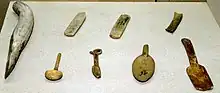 Early Shulaveri-Shomu culture had very few ceramic vessels, which were imported from Mesopotamia. Local ceramic production dates from around 5800 BC.[3] Handmade pottery with engraved decorations, blades, burins and scrapers made of obsidian, tools made of bone and antler,[4] besides rare examples of metal items, remains of plant, such as wheat, pips, barley and grape, as well as animal bones (pigs, goats, dogs and bovids) have been discovered during the excavations.[5]