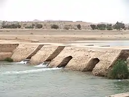 The Band-e Kaisar ("Caesar's dam"), an approximately 500-metre (1,600 ft) long Roman weir across the Karun, was the key structure of the complex which, along with the Mizan Dam (Band-e Mizan), retained and diverted river water into the irrigation canals in the area.[4] Built by a Roman workforce in the 3rd century AD on Sassanid order,[5] it was the most eastern Roman bridge and Roman dam[6] and the first structure in Iran to combine a bridge with a dam.[7]