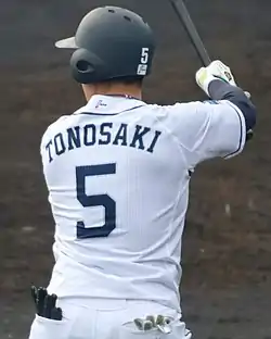 Shuta Tonosaki (外崎 修汰, Tonosaki Shūta, born December 20, 1992 in Hirosaki, Aomori, Japan), nicknamed "Apple Punch",[1] is a Japanese professional baseball infielder for the Saitama Seibu Lions in Japan's Nippon Professional Baseball.