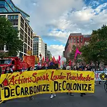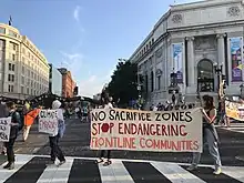 ShutdownDC led a protest opposing the Line 3 pipeline at the home of White House Chief of Staff Ron Klain; 23 people were arrested by the Montgomery County Police Department.[35] In December 2021, ShutdownDC helped organize another coalition of organizations to engage in a large blockade of traffic in Washington, D.C. centered around supporting the Build Back Better Act, which included significant climate action, as well as other progressive legislative priorities.[36] Traffic was snarled around the United States Capitol, and the United States Capitol Police arrested 38.[36] There were about 150 participants.[37] ShutdownDC organized a smaller-scale blockade the following month around the White House with similar goals.[38] In October 2022, ShutdownDC organized a coalition of organizations for a week of actions, including street marches and a bike blockade, surrounding the annual meetings of the IMF and World Bank, under the banner "For People, For Planet: Decarbonize & Decolonize".[39] Demands included an end to fossil fuel investment by the institutions, as well as the canceling of debts held by countries in the Global South.[40]