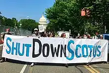 ShutdownDC has been an active participant in the 2022 abortion protests. In 2021, when the Supreme Court of the United States declined to block a law restricting abortion in Texas, ShutdownDC led a protest for abortion rights in front of the Chevy Chase, Maryland home of Justice Brett Kavanaugh, a form of protest which soon became a regular affair for conservative Justices.[28] In the wake of the leaked potential decision inDobbs v. Jackson Women's Health Organization, ShutdownDC organized large-scale street blockades in the areas around the Supreme Court of the United States.[3] Florida Governor Ron DeSantis called the peaceful blockades an insurrection on Fox & Friends.[29] Protestors with ShutdownDC went on to attempt to confront Brett Kavanaugh at a DC location of Morton's The Steakhouse, where he was dining, for his role in Dobbs v. Jackson Women's Health Organization, forcing Kavanaugh to leave via a backdoor.[30] The protest was defended by political figures such as Transportation Secretary Pete Buttigieg, who called it an exercise in "free speech", and US Congresswoman Alexandria Ocasio-Cortez, who tweeted "Poor guy. He left before his soufflé because he decided half the country should risk death if they have an ectopic pregnancy within the wrong state lines. It’s all very unfair to him".[31] The group later offered DC-area service workers up to $250 for sightings of Supreme Court Justices Brett Kavanaugh, Samuel Alito, Clarence Thomas, Neil Gorsuch, Amy Coney Barrett, and John Roberts in a viral tweet.[32] In December 2022, ShutdownDC activists disrupted a banquet held to benefit the Capitol Hill Pregnancy Center, a crisis pregnancy center at a Marriott in Crystal City, Arlington, Virginia, claiming the clinic "lies to patients, endangers pregnant people, and is part of a national anti-abortion network".[33][34]